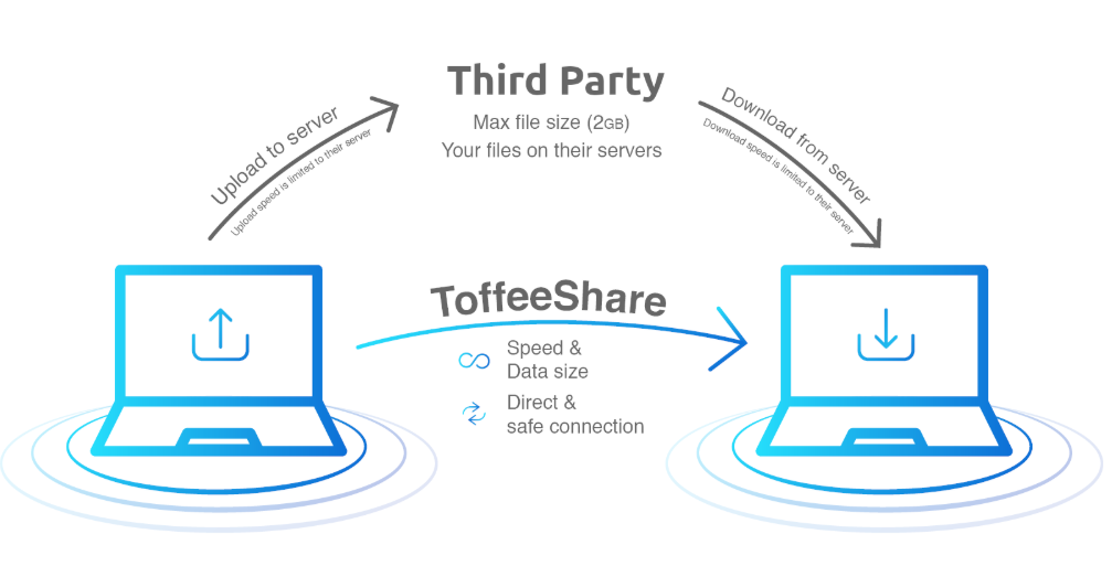 ToffeeShare uses peer-to-peer technology so files travel directly between devices without passing through or being stored on any server. This is made possible through WebRTC, which relies on a protocol called STUN.